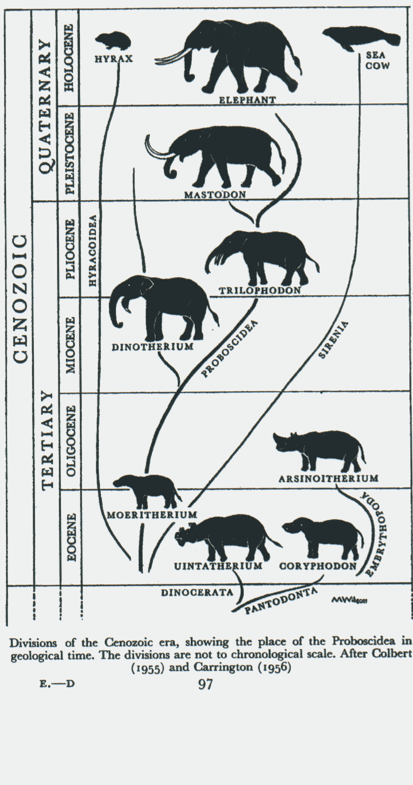 The Moeritherium probably gave rise to the elephants and to their nearest relations, the Dinotheres and Mastodons. A second branch of this family is the hyraxes and the third branch is comprised of the sea cows. This is confirmed by fossil Proboscideans of the hyraxes and sea cows from the Eocene era that show close similarities with the ancestors of the modern day elephant. Proboscidean is a word coined by Carl Illiger and means an order of mammals with a trunk. The ancient order of proboscidean contained some 164-352 different species and subspecies (Shoshani 480), classified in 44 genera and eight families.
